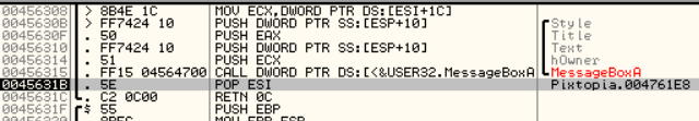 MessageBoxA를 호출한 이후 코드로 이동한 것을 볼 수 있다.