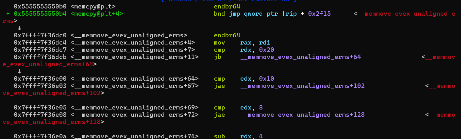 `memcpy`는 내부에서 `__memmove_evex_unaligned_erms`를 호출한다.
