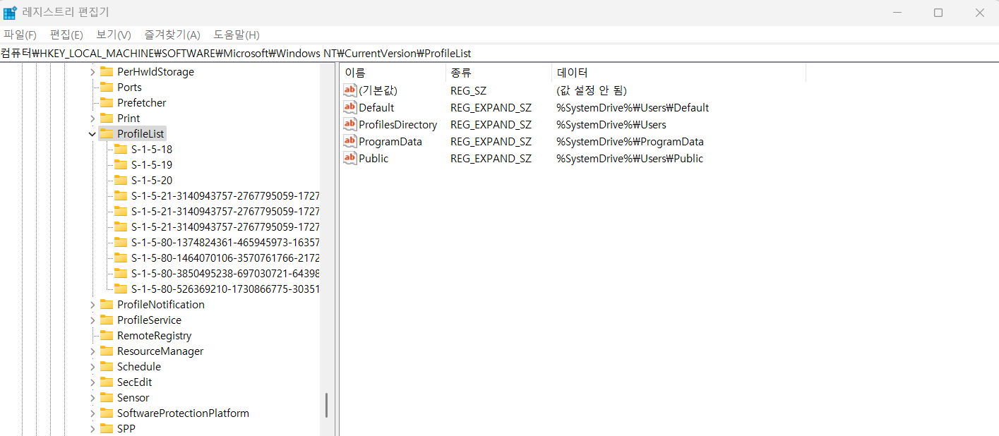 - 레지스트리 경로: HKEY_LOCAL_MACHINE\SOFTWARE\Microsoft\Windows NT\CurrentVersion\ProfileList